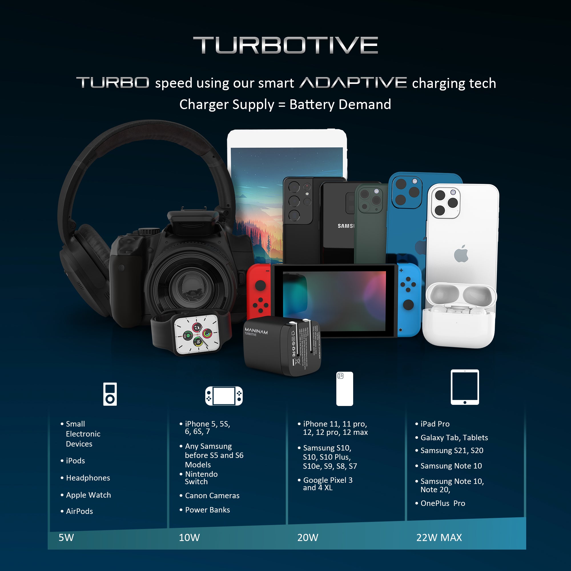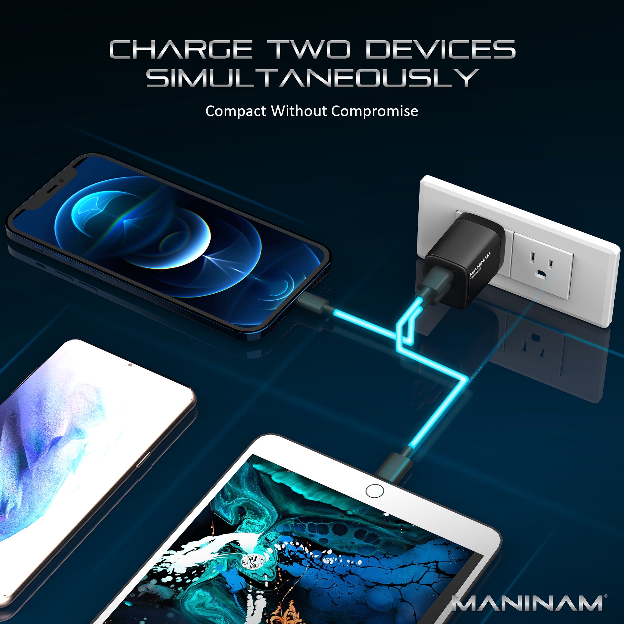 MANINAM 22W wall charger compatible with iPhone 12 is a multi-hub outlet adapter with 2 ports for USB-A and USB-C cables. It is equipped with dual fast charger with quick charge 3.0 and PPS technology. Additionally, this charger is efficiently designed as a compact block with foldable plugs. This charger block is further enhanced with Turbotive™Technology with maximum charging efficiency and adaptive capability. You can use this charger for fast charging your Samsung S21, S20, and a variety of other phones.